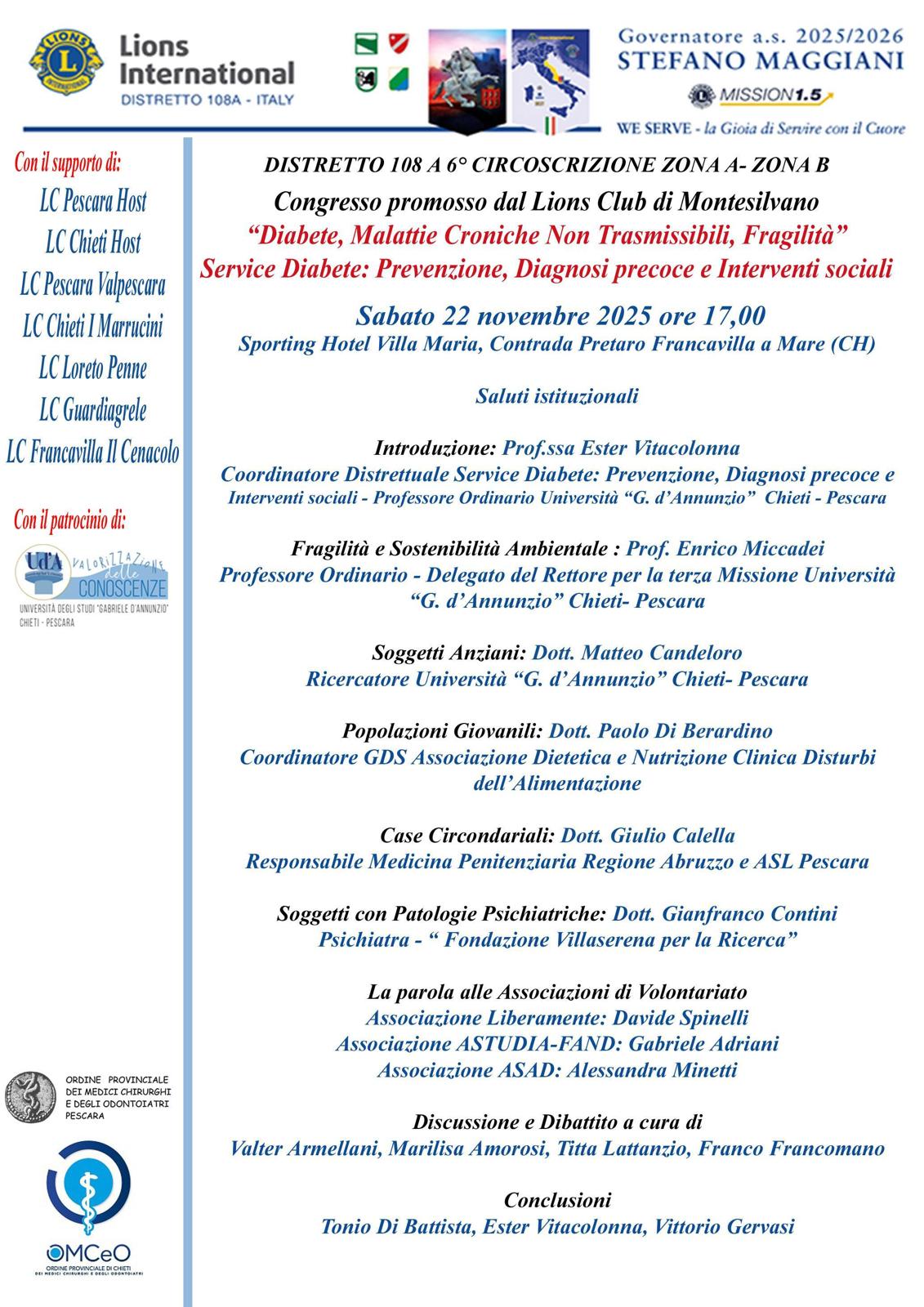 Congresso promosso dal Lions Club di Montesilvano "DIABETE, MALATTIE CRONICHE NON TRASMISSIBILI, FRAGILITA'" SERVICE DIABETE: PREVENZIONE, DIAGNOSI PRECOCE E INTERVENTI SOCIALI