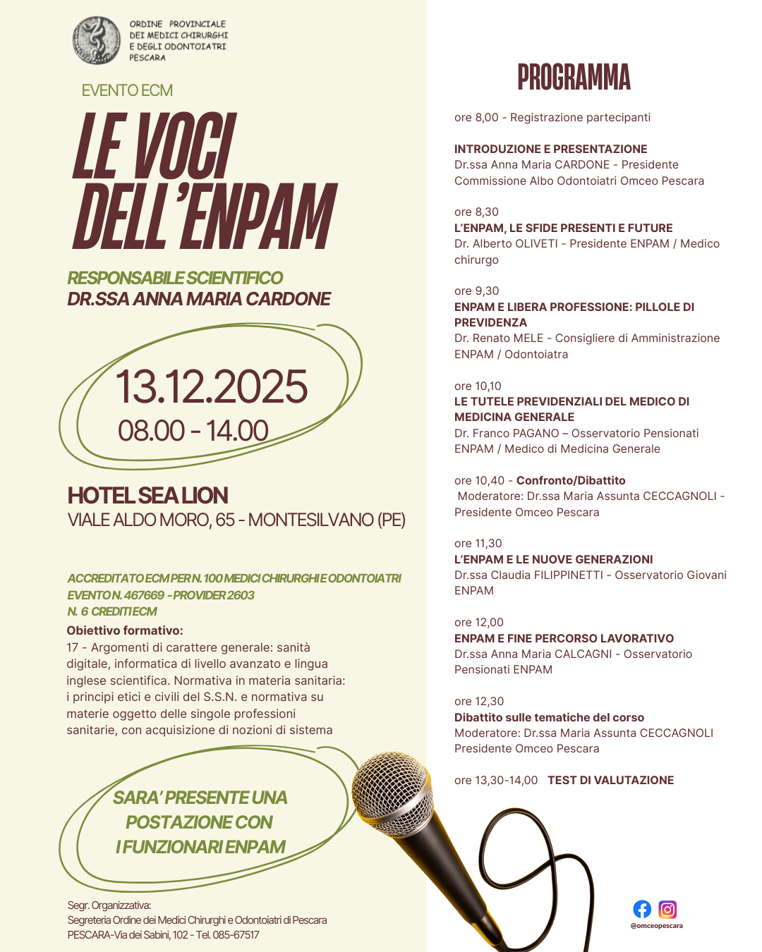 Gli iscritti Omceope possono iscriversi online o chiamando il n. 08567517. La prenotazione anche per la consulenza Enpam sarà possibile SOLTANTO per i primi 50 iscritti Omceope che contatteranno il n. 08567517.